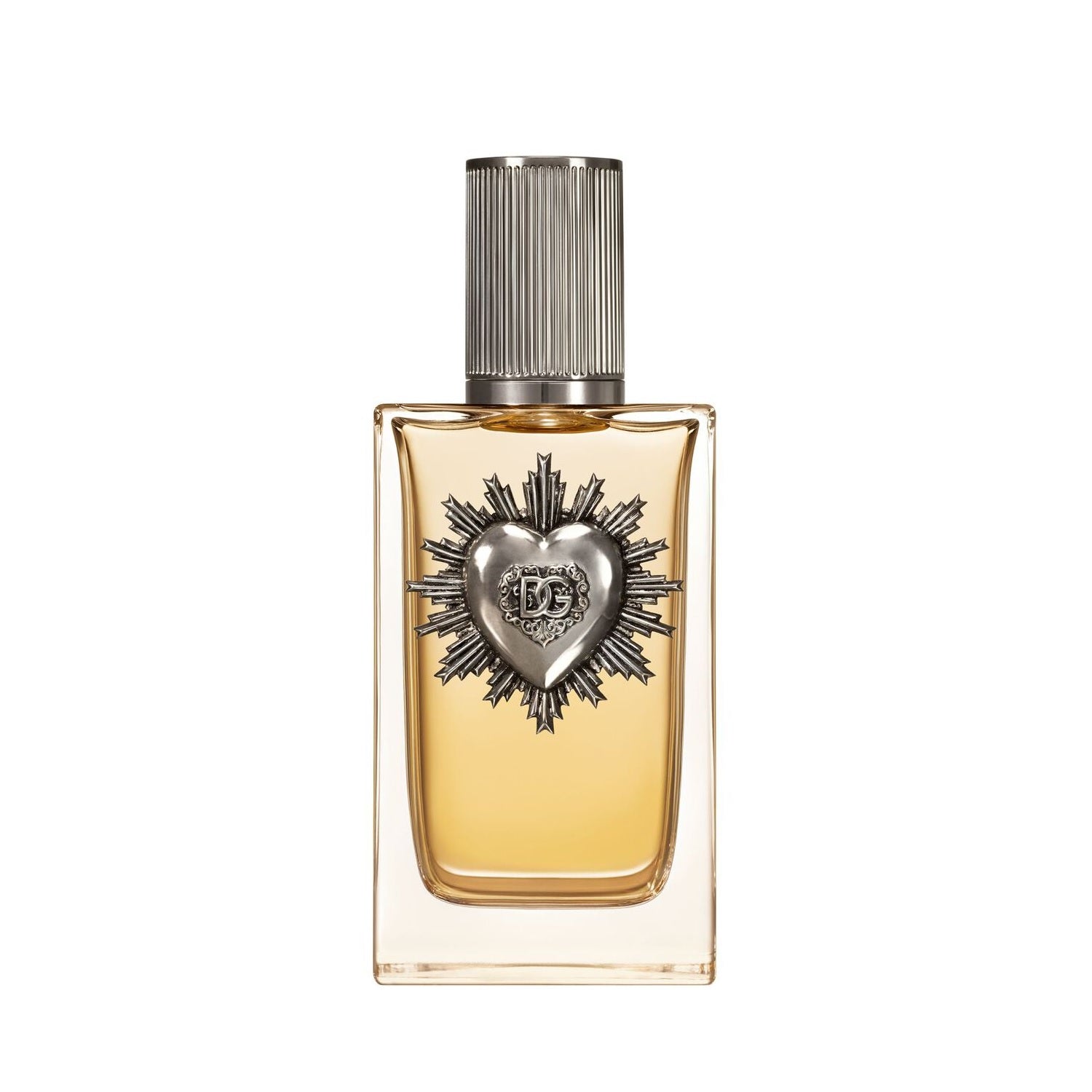 Le flacon en verre de Dolce & Gabbana Devotion For Men Eau de parfum, arborant la même silhouette que celle de la version féminine, en revisite les codes. La fragrance de couleur or clair est contenue dans un flacon agrémenté du Cœur Sacré en argent, assorti au bouchon.