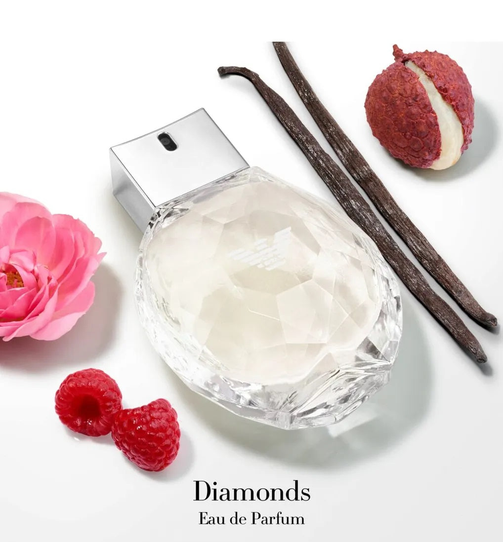 Emporio Armani Diamonds est un parfum absolument féminin, irrésistible, plein d'éclat, couronné d’une pointe d'audace...un parfum construit autour de la plus belle rose bulgare, avec une touche fruitée litchi et framboise audacieuse, inédite et extrêmement sexy.